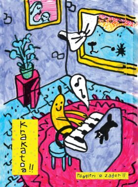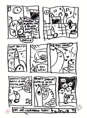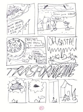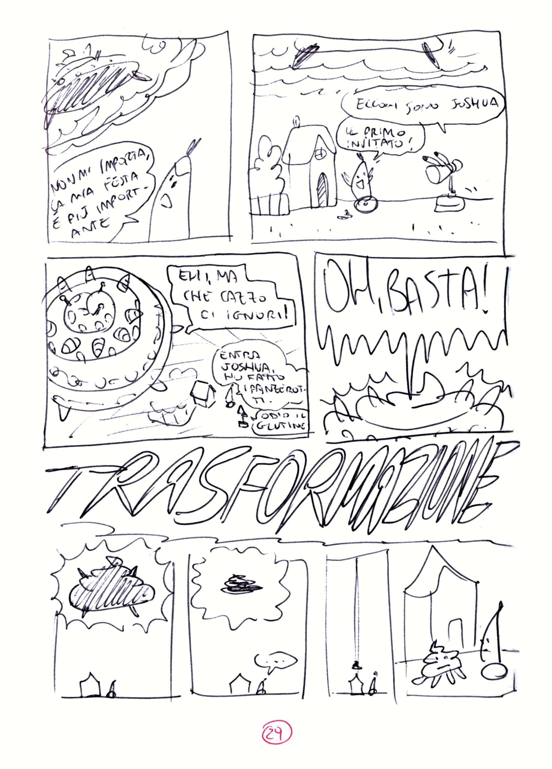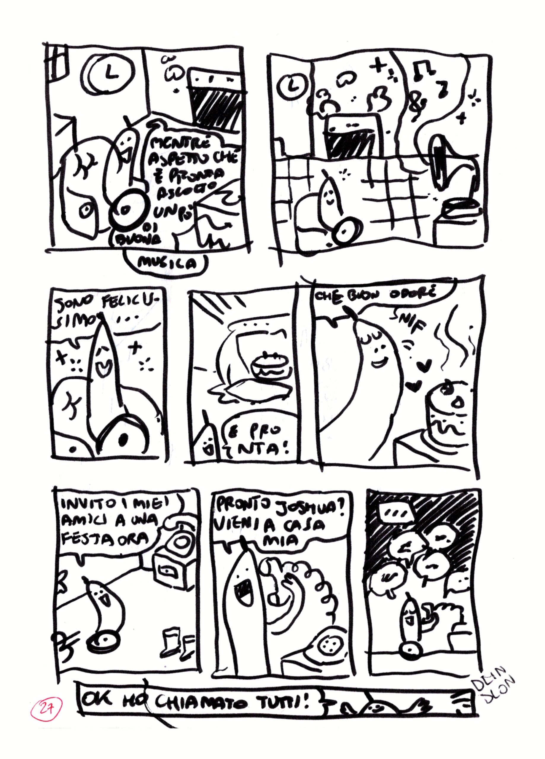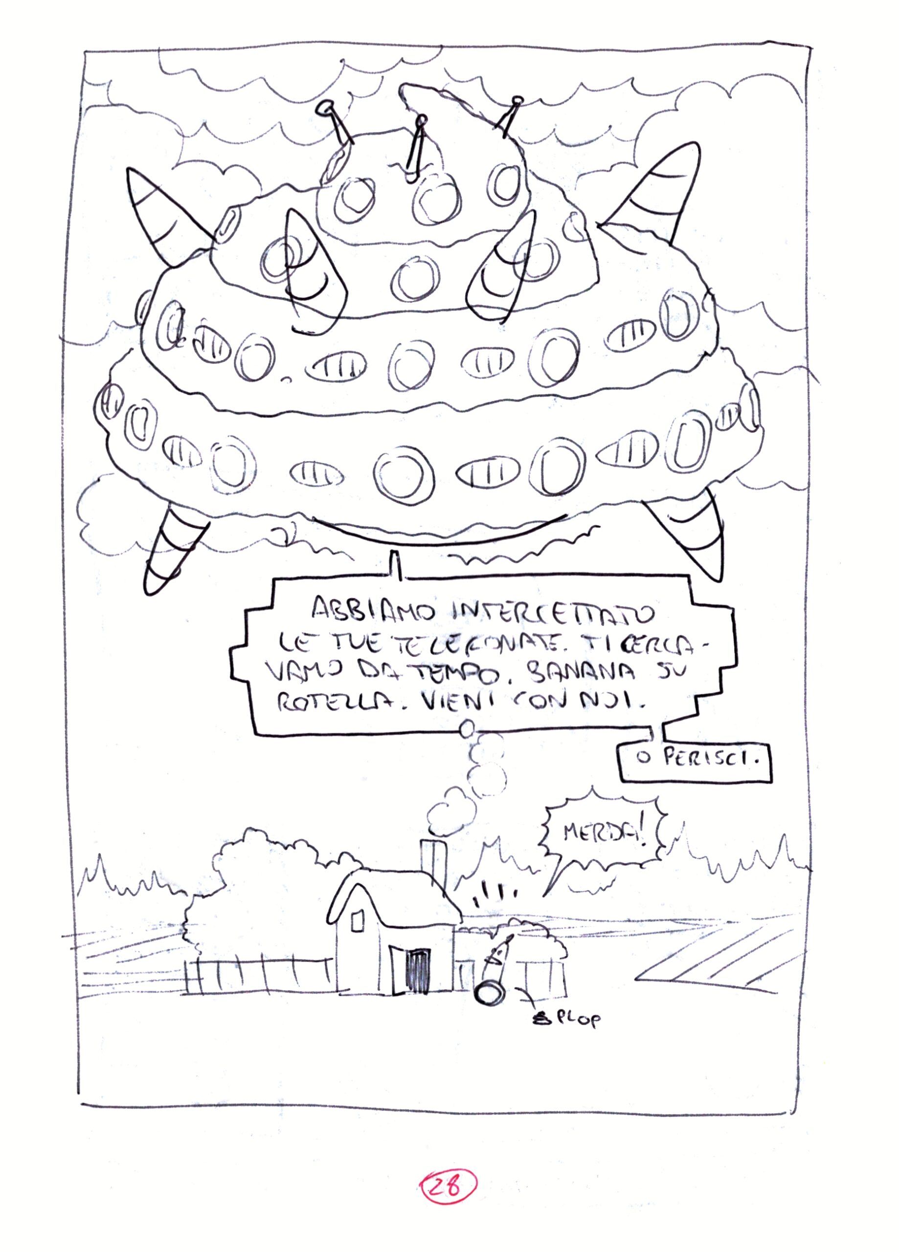 C’è la banana-su-ruota che fa la festa a casa sua con la torta poi invece prima c’era la regina muscolosa che faceva il sesso e dopo alle fine c’è il conquistatore spaziale che i colori non li vedeva tanto bene e poi e poi aaa poi